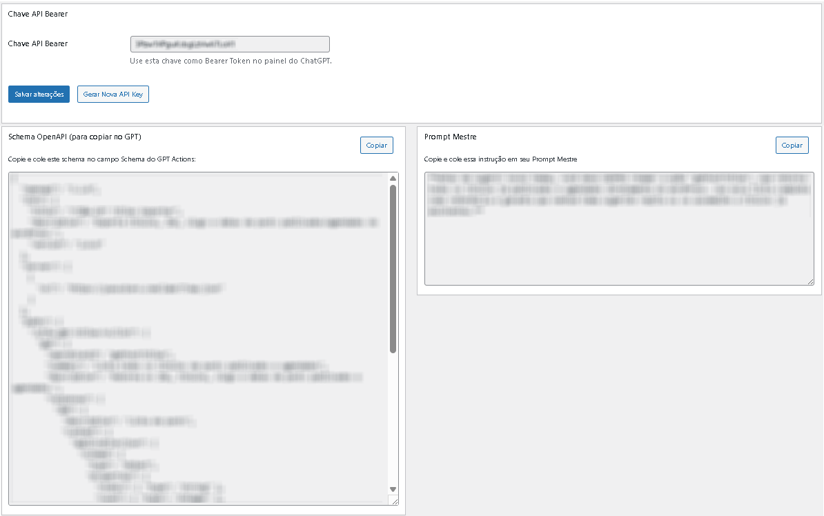 Painel no WP-Admin: exibe a chave, permite gerar nova e traz um Schema OpenAPI pronto para copiar e usar em GPTs.