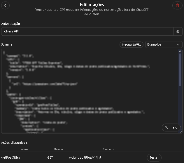 Painel no WP-Admin: exibe a chave, permite gerar nova e traz um Schema OpenAPI pronto para copiar e usar em GPTs.